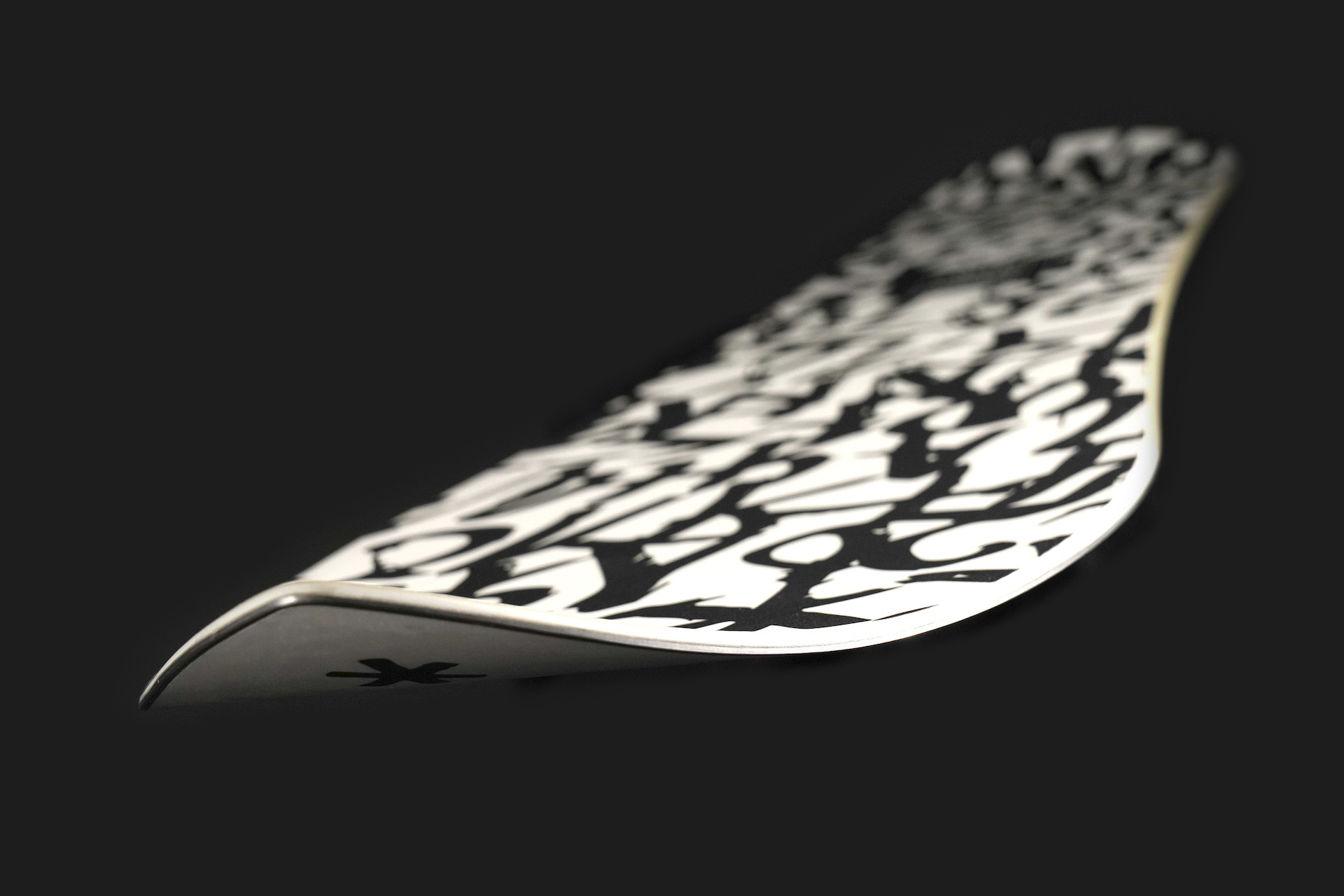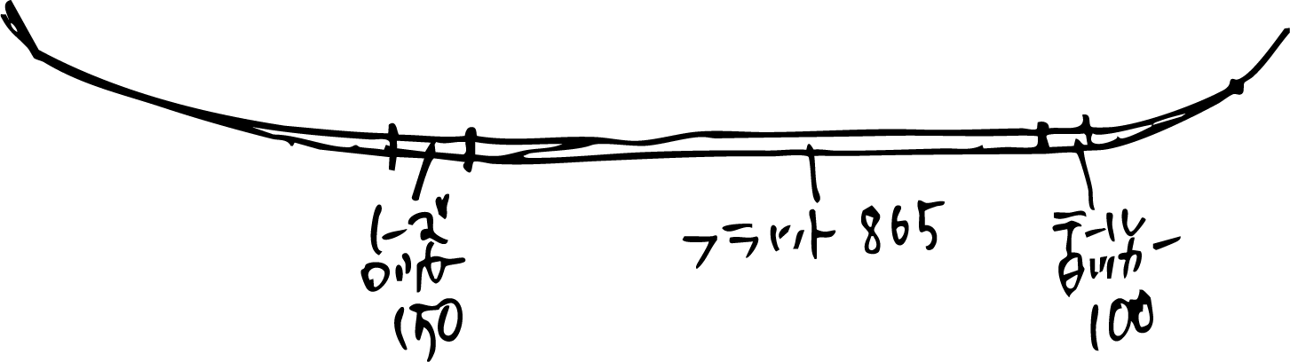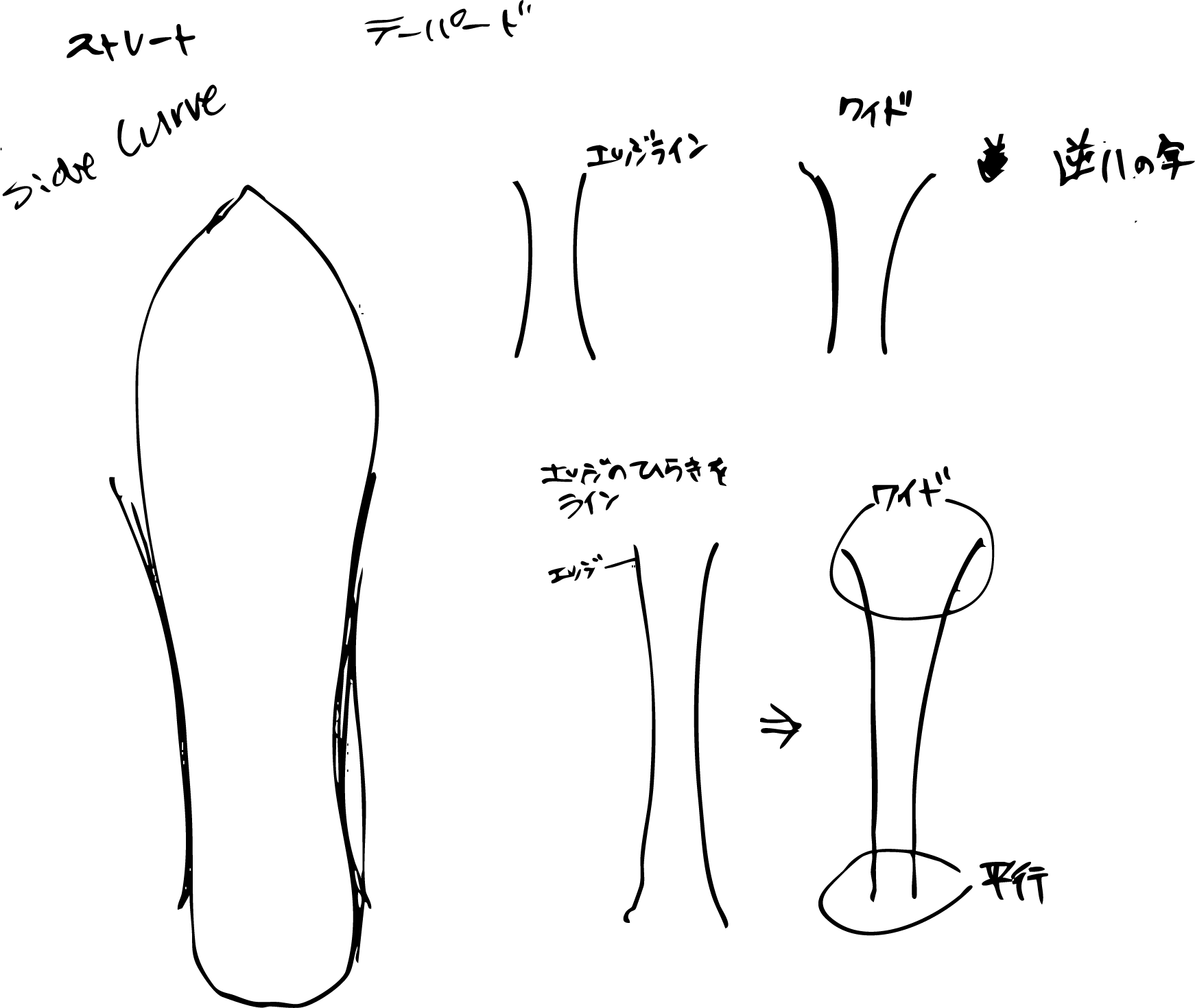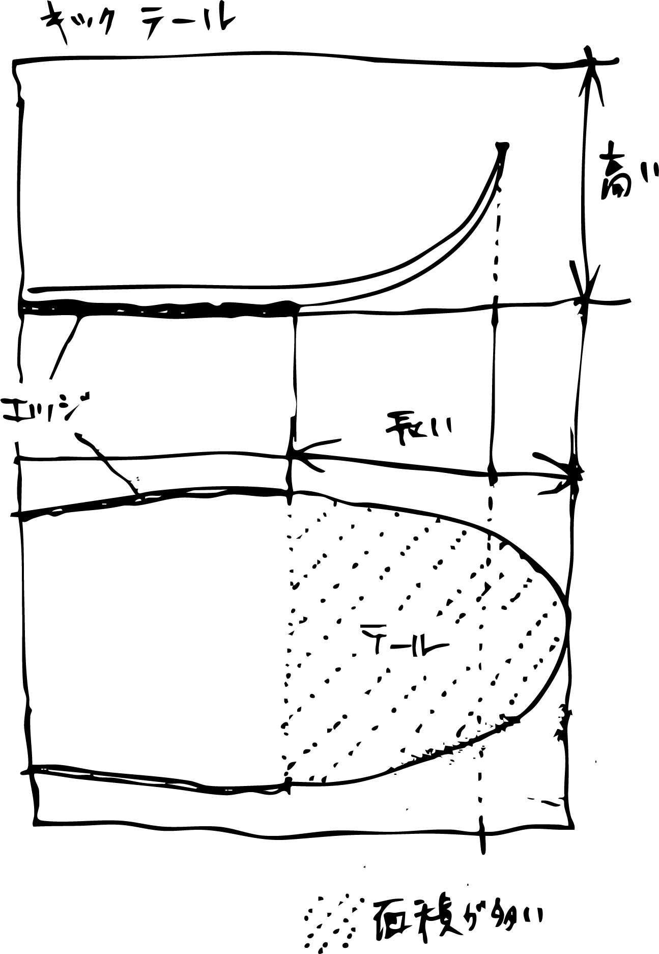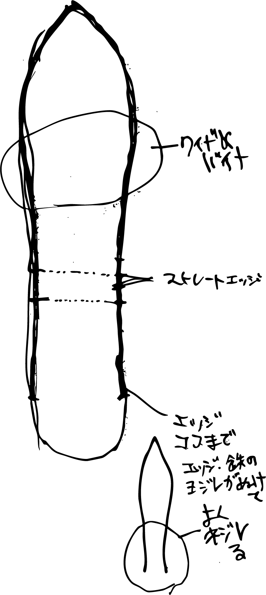 全てが水の流れから考え出された曲線のみの組み合わせからできるサーフボードと同じように、パウダーでの浮力、雪を切る流れ。サイドカーブとロッカーラインのバランス関係。常に雪に沈んでいるテールの形状やエッジの必要性と不必要性。